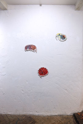 Ausstellungsansicht der Bildserie "Aus Mensch werde Tier werde Mensch werde Tier" und der offenen Köpfe
